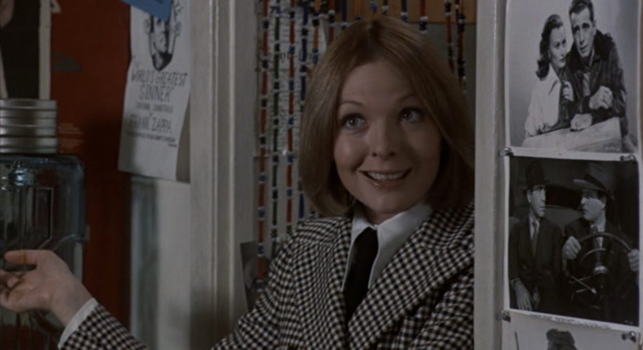 Keaton is in her own world and style in the 1970s, but she is very far from a dithering Lee Strasberg actress like Sandy Dennis because everything she does is ultra-legible in a distinct way that helped to make her a truly popular star. She will sometimes press down unexpectedly hard on a word or a reaction because she wants to keep us off balance, and always there is a sense of spontaneity, so that she seems to be living and working out her part in the moment, right then, which makes her capable of surprising both us and herself.