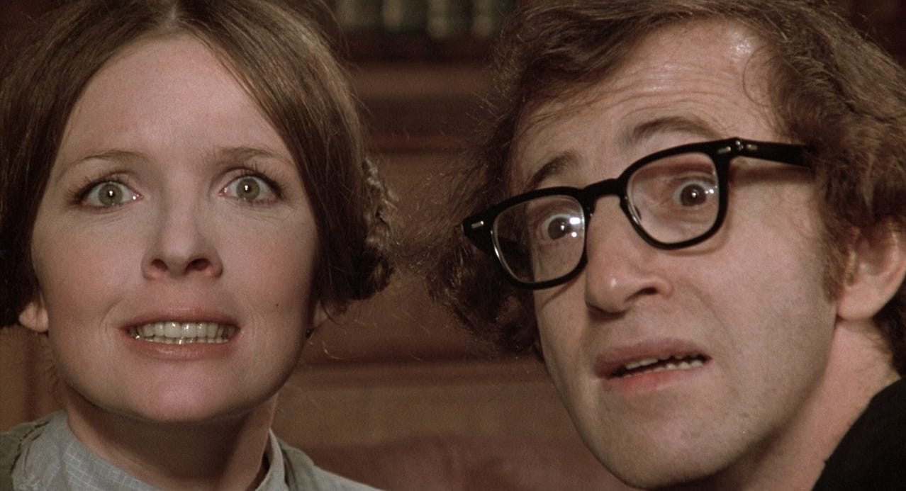 Also in Love and Death there’s the classic “fields of wheat” bit where Keaton stares right into the camera while Allen stares slightly off and she worries about suffocation in a relationship with him and cries, “Open a window…no, not that one, the one in the bathroom.” The slightest wavering or lack of conviction in facial expression or intonation would kill the bit, which is sending up pretentious art films while also harkening way back to Groucho Marx’s send-up of Eugene O’Neill’s play Strange Interlude in Animal Crackers (1930), but Keaton stays just focused enough without ever pressing too hard. And then there’s a wonderful sort of blooper scene here where a prop doesn’t quite work and Allen cuts the sound and keeps hitting Keaton over the head with a bottle, which she takes gamely and apologetically, as if to say, “Of course!” until she finally falls back down a wall and pretends to be knocked out, like a kid playing outside with friends and clearly having a ball.