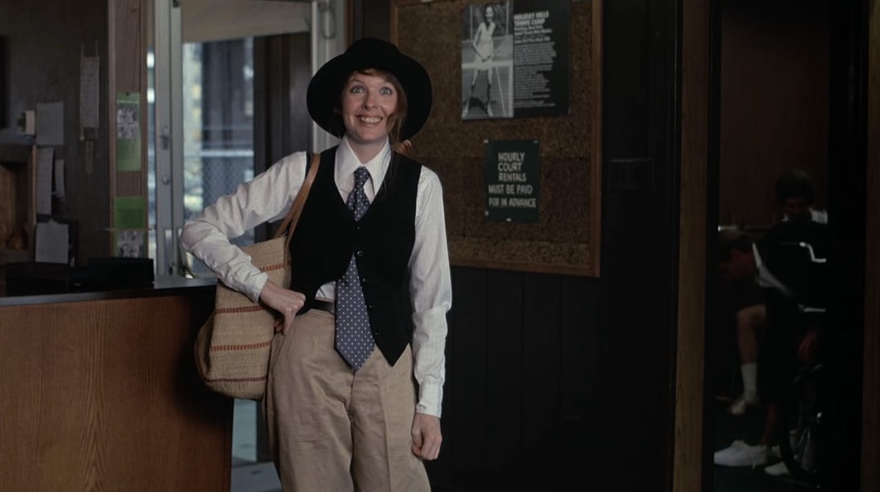 Keaton studied acting in the 1960s with Sanford Meisner, and he is best known for a repetition exercise where you stare deeply into the eyes of your scene partner and repeat things you notice about them: “You’re wearing blue,” one actor will say, and the other actor will repeat, “I’m wearing blue,” and so forth. That training shows in Keaton’s work because she is often able to burrow deep down into a scene when she feels comfortable with another actor.