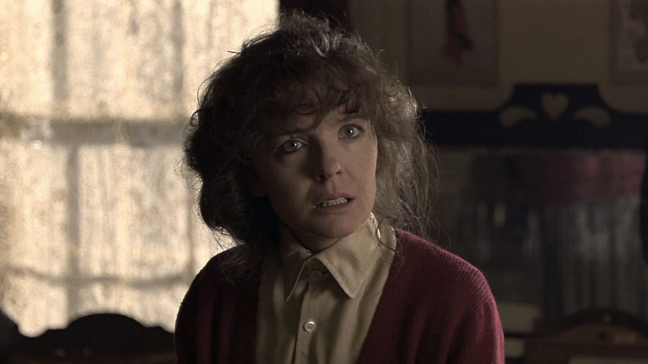 Keaton excelled in Mrs. Soffel (1984), a period piece in which she was the repressed wife of a prison warden in 1901 Pittsburgh who opens up to Mel Gibson’s prisoner Ed Biddle. She plays the first scenes in a haze of illness and cloudy unrest, but as she falls in love with Gibson’s Ed, Keaton slowly breaks out her most star-like smile, and she even leers at him, in a pretty modern sort of way, as he takes a saw from under her skirt (this anachronistic performing risk really pays off as a relevant shock amidst the film’s moody languor).